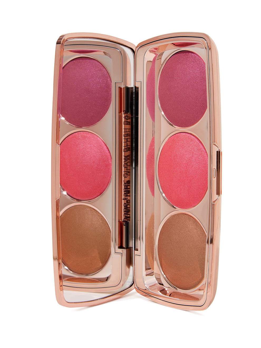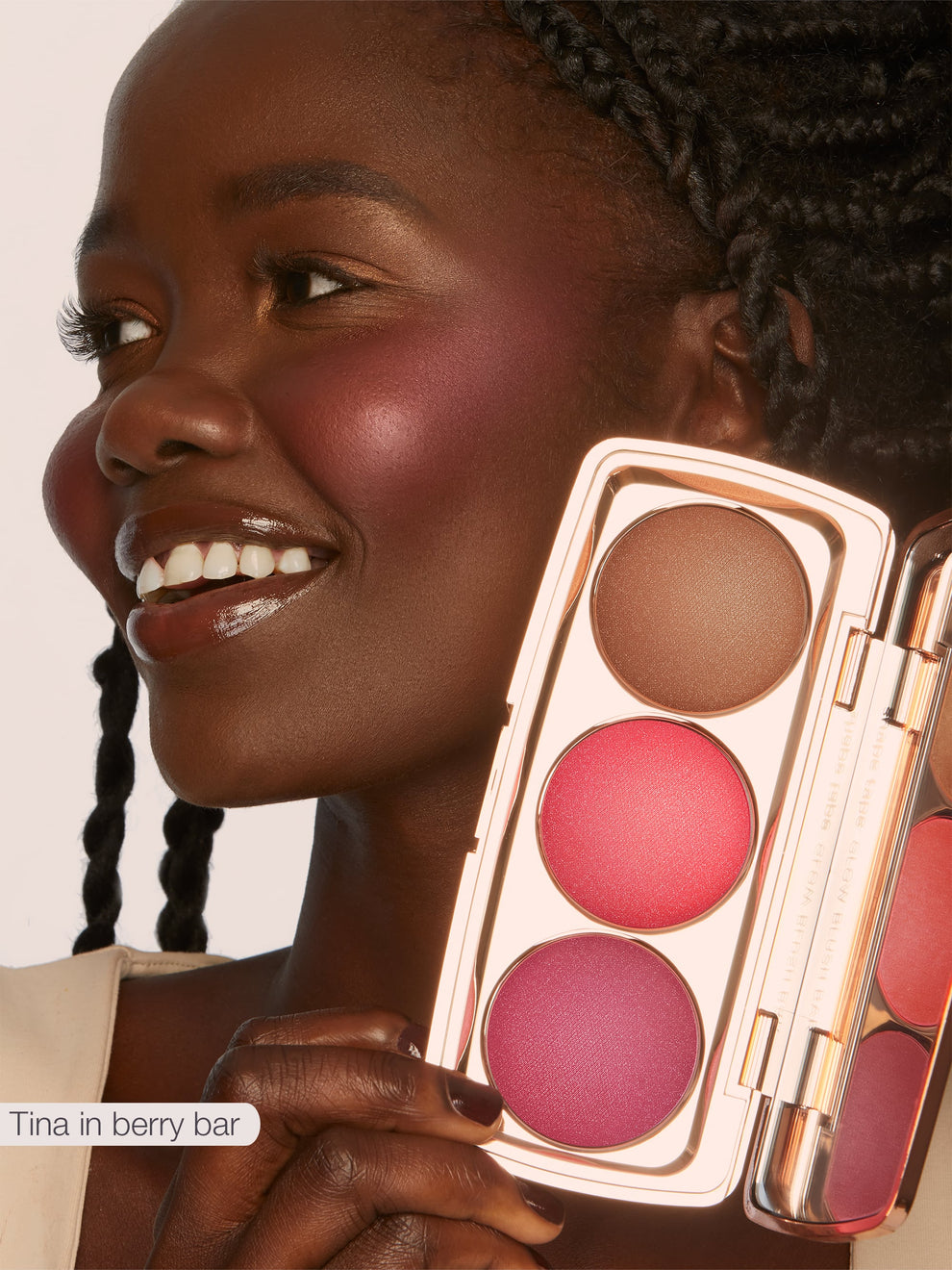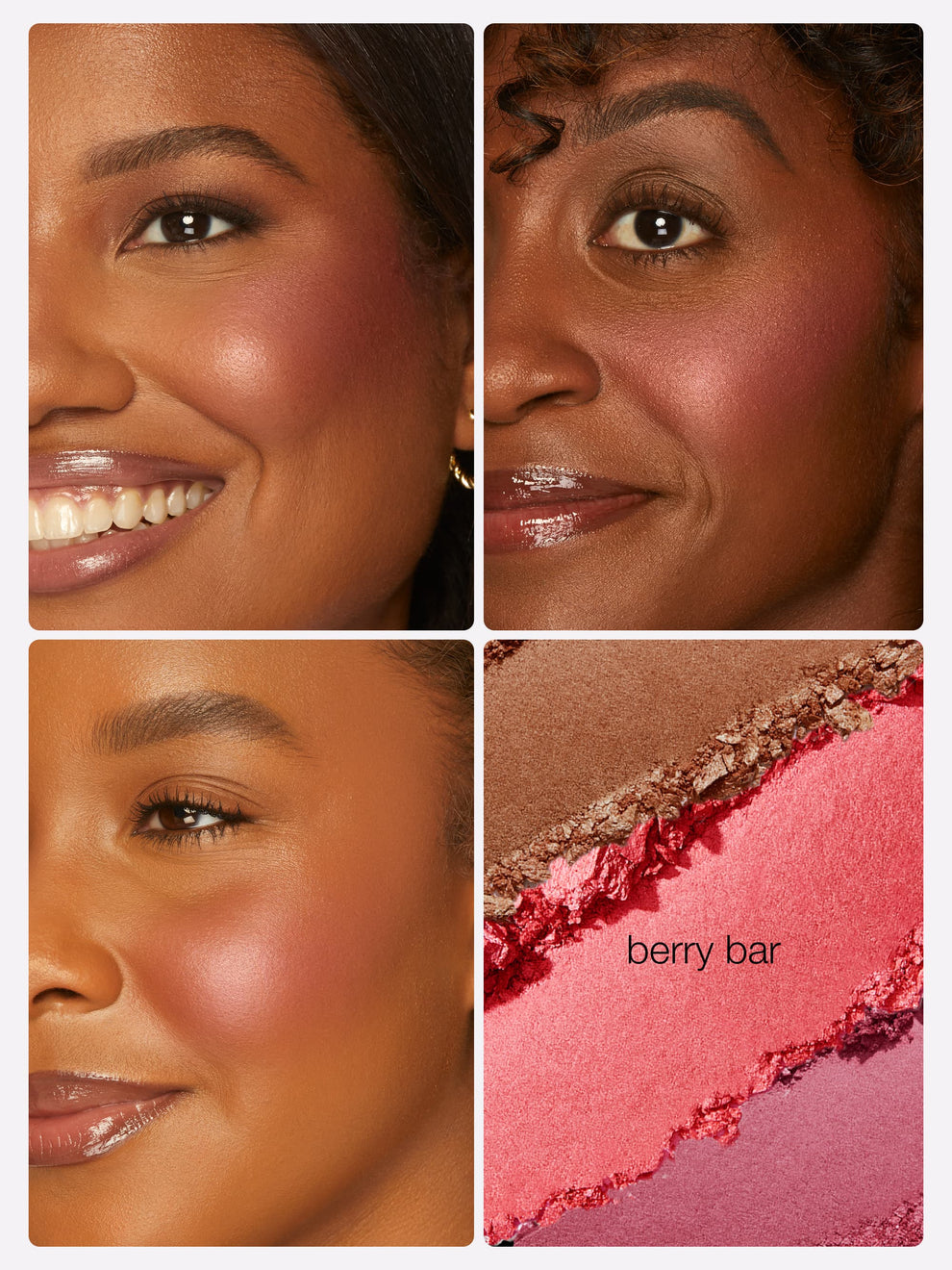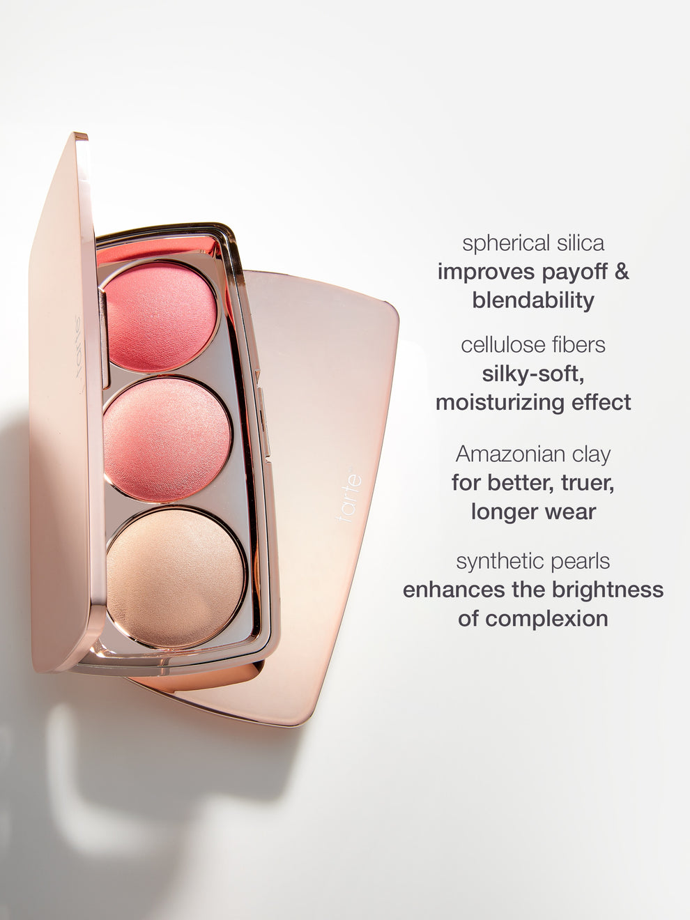 Baked blush trio for an instant cheek lift effect! Shape tape™ glow blush bar serves soft-focus radiance & the perfect pop of color.